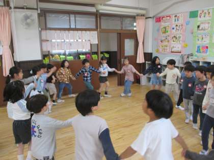 1年生の音楽で、『ひらいた ひらいた』の曲に合わせて、みんなで輪になって遊びました。れんげの花の様子を想像しながら、つぼんだり、ひらいたり・・・。みんなの息がそろってくると、きれいな輪になってきて「きれいなお花が咲いた!」と盛り上がりました。