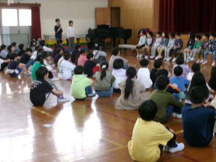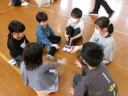 本日3校時は、初めて全校児童が体育館に集まりました。入学して2週間がたった1年生も、正親小学校の一員となった実感を味わうことができたのではないでしょうか。6年生からプレゼントをもらった後は、たてわりグループのみんなと輪になって、自己紹介をしました。