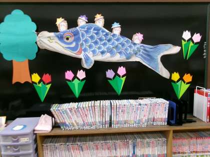 5月を迎え、図書館も新しく飾っていただきました。最近泳ぐ姿はなかなか見られなくなりましたが、写真の立派なこいのぼりは学校にあった古いものだそうです。小さくて色とりどりのこいのぼりもたくさん飾られています。ぜひ、見に来てください。
