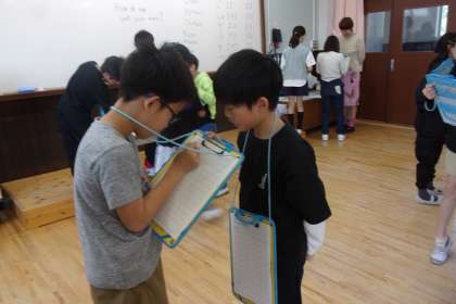 外国語の学習では、自分の名前を英語でどう書くのか教えあいました。