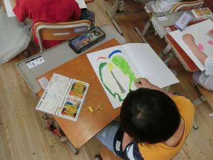 不思議なたまごから想像したことや、不思議なたまごから生まれてくるものを楽しく想像して、画用紙いっぱいに絵を描いていました。