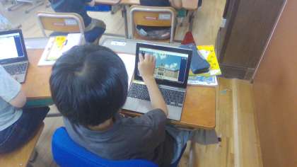 京都市の様々な場所についての資料を元に、タブレットを使って調べ学習をしています。