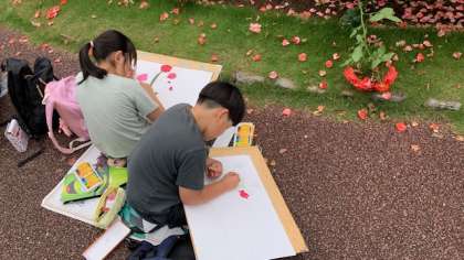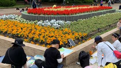 少年補導正親支部の皆さんにお世話になり、京都府立植物園で写生大会が行われました。雨上がりの植物園では、花が瑞々しく咲いていました。参加した子どもたちは思い思いに白い画用紙に花を描いていました。