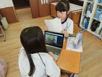 「たんぽぽのちえ」で学習したことをもとに、「しょくぶつのちえクイズ大会」をしていました。クイズに出てくる植物の写真をGIGA端末で提示し、その植物の知恵を考える手掛かりとしていました。