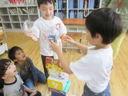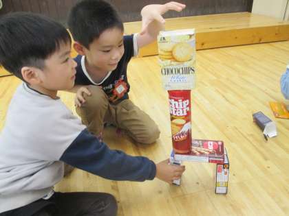 算数科「いろいろなかたち」の学習で、箱や空き缶を使って、動物や乗り物などを作りました。友達と一緒に楽しく活動しながら、それぞれの形の特徴に気付くことができました。