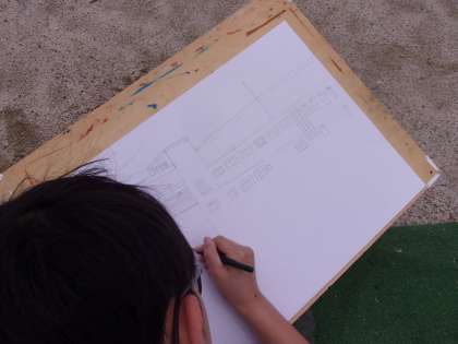 建物や遊具など、一つ一つの形や大きさをよく見て下絵を描いています。
