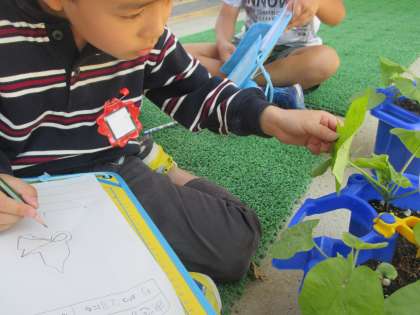 生活科の学習で育てているアサガオの葉が、大きくなってきました。子どもたちは、芽が出たばかりの頃の様子を思い出し、じっくり見たり触ったりして違いを見つけていました。「触るとちくちくしてる」「手のひらみたいな形をしている」など、気づいたことを観察カードに書きました。