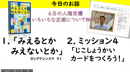 朝会は、「いろいろな友達について知ろう」をテーマに、絵本「みえるとかみえないとか」(ヨシタケシンスケ)の紹介とミッション4「自己紹介カードを作ろう」についてのお話がありました。互いのことを知って、それを認め合うということは簡単ではないかもしれません。考えたり話し合ったりする時間が必要な場合もあります。今月は、いじめアンケートを行った後、担任が子どもが一人一人と話をする「あのねタイム」を実施します。普段から気になっていることがあれば、この機会に話せるといいなと思います。