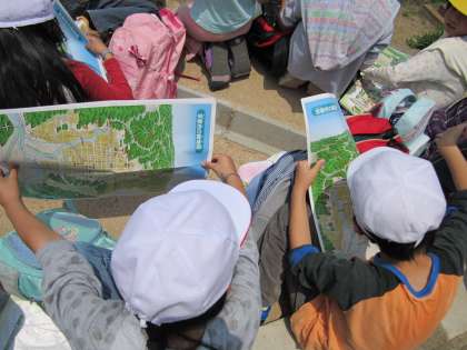 3年生が社会見学に行きました。大文字山に登り,みんなが暮らしている京都市の街はどんな風に広がっているのかを地図帳と見比べてきました。『京都って山に囲まれているんだね!』『あれが御所だからあれは何通りになるかな?』『街が小さいから自分達が巨人になったみたい!』などなど,様々な意見や感想が出てきました。実際に自分達の目で見ることで気づくことがたくさんあったようです。