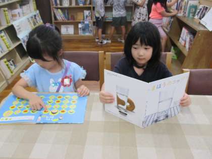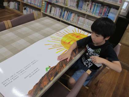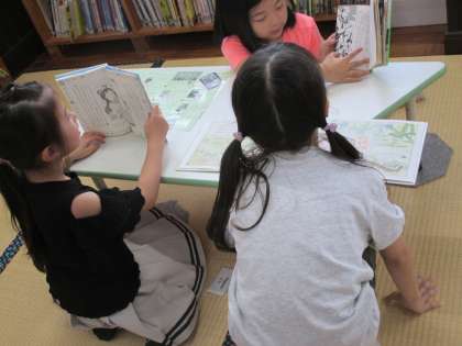 国語科の学習の時間に、図書館へ行きました。休み時間になるといつも、みんなうきうきした様子で「図書館へ行ってきます!」と、図書館へ向かっています。今日は、クラスのみんなで、いろいろな本を手にとって読みました。大きな本や飛び出す絵本などを見つけて、楽しそうでした。