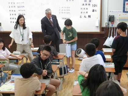 上京税務署と地域にお住いの税理士の方にお世話になり、租税教室を行いました。税金の意味や税金によって住みよい暮らしが成り立っていることなどを学びました。また、1億円分の紙幣と同じだけのかさと重さのジュラルミンケースを実際に持たせてもらいました。とても重かったようです。