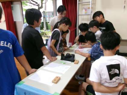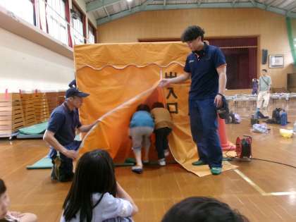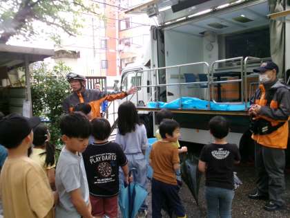 10時からは、上京消防署の皆さんにお世話になり、起震車と煙幕の体験、マンホールトイレの学習を3つのグループに分かれて行いました。大人も子どもも楽しみながら新しいことを学ぶことができ、備えの大切さを感じることができました。