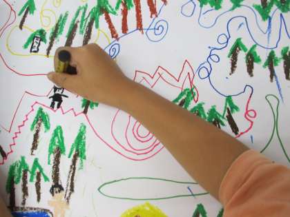 図画工作科の学習で、「線の冒険」を絵にしました。ぎざぎざ、くねくね、くるんくるん……いろいろな線で、冒険してみたい世界を表現しました。描いた線から思いついたことや、周りの様子をパスで描き加え、想像を広げながら活動することができました。