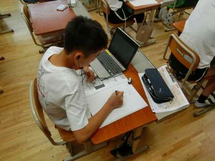 一人一台端末を使った学力調査(CBT:Computer Based Testing)を体験しました。3年から6年の算数で実施する予定になっており、今日は、6年生が問題に向き合っていました。CBTの場合、問題は動画や音声でも出題されます。児童はイヤホンを付け、画面を何度も見直していました。必要に応じてノートに計算やメモをして解答をGIGA端末に入力していました。