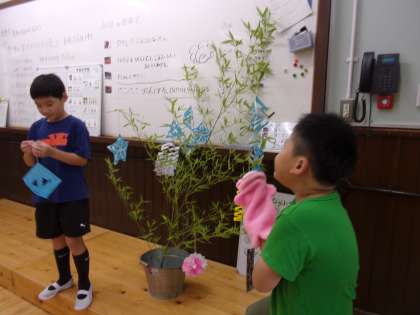 校舎北の広場に小さな小さな竹やぶがあります。毎年ササを切ってお飾りをかざっています。たんざくにかいたみんなの願いが、かなうといいですね!