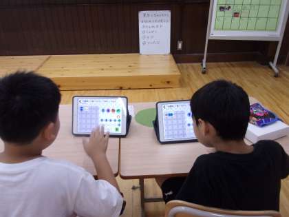 算数の時間、タブレットで大好きな「プログラミング」の学習。いつものようにどちらともなくと机をつけて、なかよく楽しそうにスタートしました。