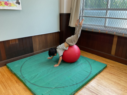 バランスボールにのって、リズムよく足を上げ下げ。楽しみながら体幹や集中力を育んでいます。