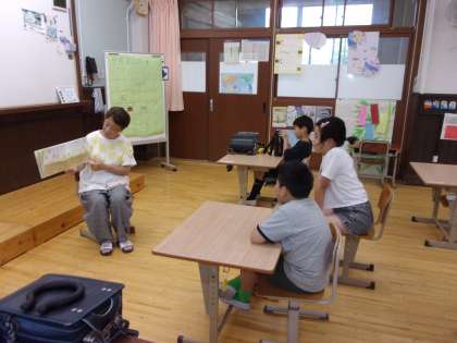 学校図書ボランティアの岩谷さんが読聞かせをしてくださいました。「せんたくかあちゃん」です。真っ白なたくさんの洗濯ものが干してあるようすなど、暑さをふきとばすさわやかな場面がたくさんでてきたお話でした。みんなもさわやかな世界に入りこんで物語を楽しみました。