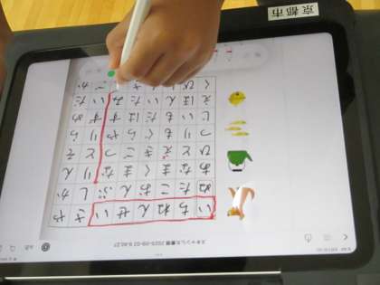 国語科の学習で、表に書かれているひらがなから言葉を見つける活動をしました。たて、よこ、ななめに隠れている言葉をたくさん見つけました。今後、自分でオリジナルの「ことばみつけゲーム」を作り、友達と解き合う予定です。みんなわくわくしています。