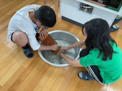 手洗いの仕方を学習し、自分のハンカチを実際に洗濯しました。