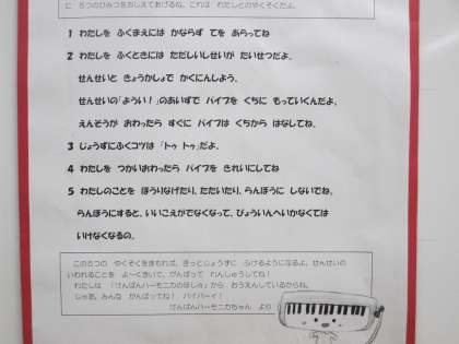 今日から鍵盤ハーモニカの学習が始まりました。初めに、みんなで、鍵盤ハーモニカの使い方について確認していると…なんと、鍵盤ハーモニカちゃんからお手紙が届きました。中を開けてみると、鍵盤ハーモニカちゃんから、正親小学校のみんなへのメッセージが書かれていました。5つの約束を守って、上手に演奏できるようになりたいですね。