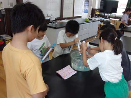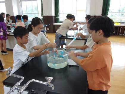 今日は、水も空気と同じように、押し縮めることができるかを調べました。実験の結果から、ピストンを押したときに、中の水がどうなったかを考えました。子どもたちは、空気との違いについて、気付いているようでした。
