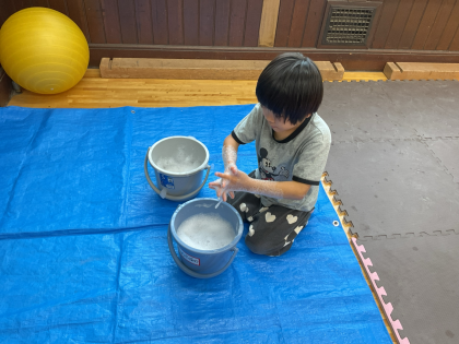 バケツでたくさん泡をつくりました。水をかき混ぜて泡が増やしだり、泡を取り出して形を作ったりしていろいろな活動をしました。不思議な感触を繰り返し楽しみました。