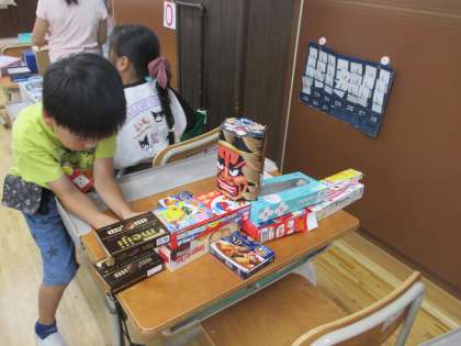図画工作科の学習で、色々な形の箱を組み合わせて作品を作りました。箱の形や色、模様も生かしながら、想像を膨らませて作りました。「本物の車みたい!」「かっこいい船だ!」「僕は家を作ったよ」など、友達と作品を互いに見合いながら活動を楽しみました。