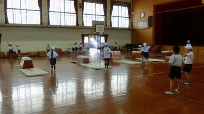 とびばこの学習をしていました。今できる跳び方で、とびばこの高さや向きの違う場に挑戦していました。