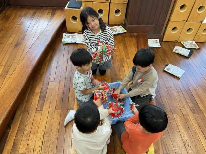 今日の音楽の学習で、はじめて音楽室に行きました。広い教室にたくさんの楽器があり、子どもたちはとてもワクワクしている様子でした。今日はトライアングル、すず、ウッドブロック、タンブリン、カスタネットを実際に鳴らして、どんな音がするかをたくさん試してみました。「かわいい音がするよ。」「こんな鳴らし方もできるよ。」と友達と交流しながら、自分のお気に入りの楽器を見つけることができました。