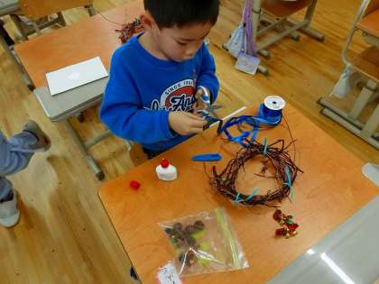 春から大切に育ててきたアサガオのツルを使ってリースを作っています。