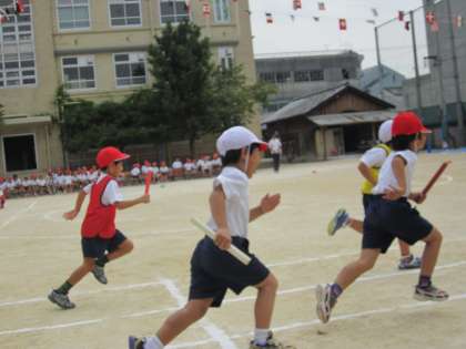たてわりグループ二つが組んでチームを作り,リレーをしました。