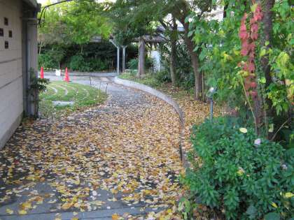 木々の色づいた葉,落ち葉,かりんの実も色づいています。
