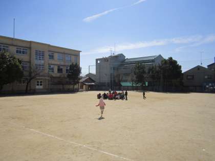 中間休みの時間だったので,運動場で遊んでいた子どもたちは運動場の真ん中に集まって身をかがめました。