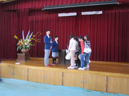 3月22日(金)修了式の後,本校の環境委員会の子が中心になって集めたペットボトルキャップを二条中学校の生徒会本部役員の方に手渡しました。