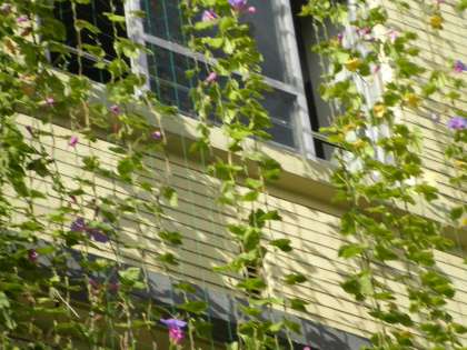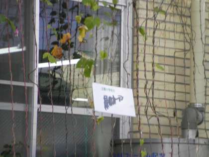 10月16日 気温の変化とともに,緑のカーテンのオーシャンブルーの色が濃いブルーからピンクに変身しました。気温が20度を下回ると色が変わるようです。今日は,ピンクの花が咲いていました。