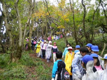 11月3日 9時20分にスタートした天狗山の山登り。みんな元気にチャレンジしました。心配された雨も昼食後に霧雨がパラパラ降ったぐらいで何とか持ちました。落葉樹も多くあり,秋の山を満喫しました。「思ったよりしんどかった」「足がくたくた」「汗びっしょり」など子どもたちから声があがっていました。