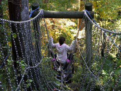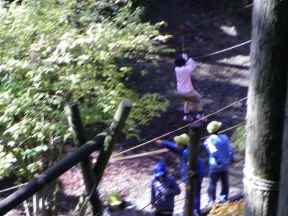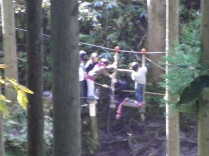 11月5日 冒険の森では,つり橋やスロープ,ターザン,上り棒などいろいろな楽しいものがありました。キャーキャー言いながらみんな楽しそうでした。手を持って,誘導している子どもたちもいました。友情,協力,助け合い,励まし合いなど山の家のまとめにふさわしい活動が出来ました。