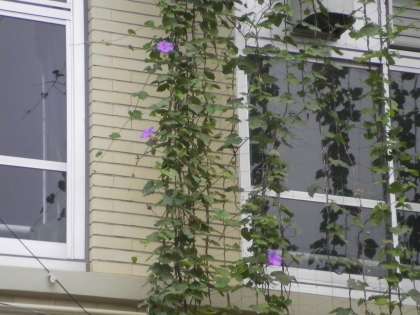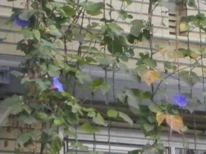 11月7日 緑のカーテンのオーシャンブルーがさわやかな早朝に綺麗に咲いていますブルーとピンクがとても綺麗に映えています。ツルは,12月にクリスマスのリースに変身します。低学年の生活科で使います。
