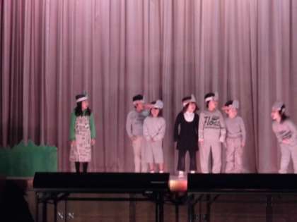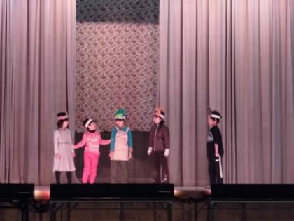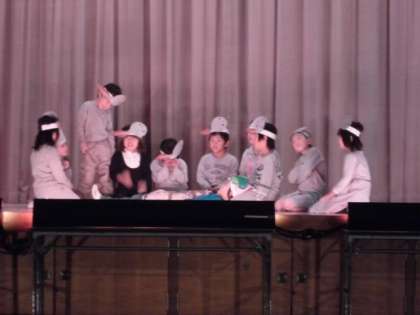 11月25日 次々とリハーサルが進んでいます。今度は1年生の番です。大きな声が出ています。みんなせりふも間違わずに頑張っています。たくさんのオタマジャクシやアメンボなど水の中の生き物が出ていました。みんな,上手ですよ! 頑張って,1年生!