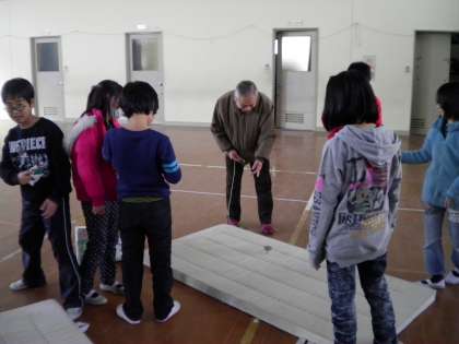 2月4日 今日の午後,3年生が社会科の授業で昔の遊びについて学習しました。ゲストティーチャートして地域の高齢者(鶴齢会)方に来ていただきました。5時間目は,体育館で「メンコ」「こままわし」「おじゃみ」「だるまおとし」等体験しました。また,6校時には中庭で,七輪を使って「もち焼き」をしました。自分達のおじいさんや,おばあさんと同じ世代の方々と一緒に交流しながら昔の事を学べて,子ども達も喜んで学習していました。ありがとうございました。