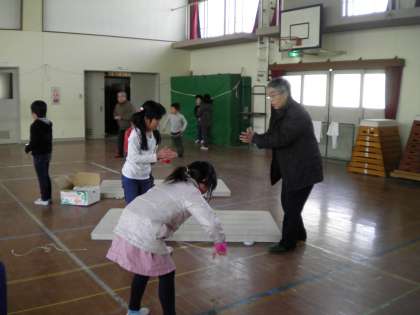 2月4日 体育館での遊びでは,子ども達も初めてする遊びも地域の方にやさしく教えてもらっていました。