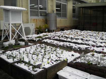 2月8日 今日は,朝から雪で学校の中も真っ白になっています。正門のところの花壇には2〜3センチメートルの雪が積もっていました。満開の水仙は,雪の重さで花が垂れさがっていました。