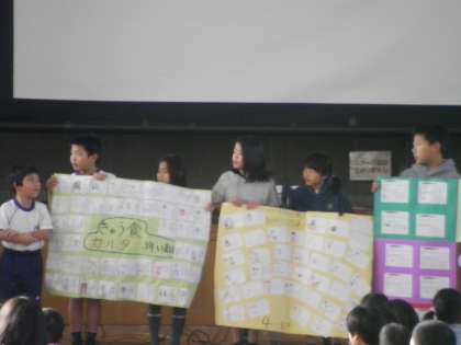 2月8日 昨日の朝会では,給食調理員さんに感謝のつどいと各委員会の発表会がありました。まず,給食週間の取組の発表と給食調理員さんへの質問・感謝のメッセージプレゼントがありました。その後,園芸委員会・図書委員会などがクイズなど交えて発表しました。