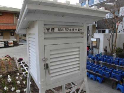 2月12日 1月の下旬から花壇のところにある百葉箱のリニューアルに取組ました。古くなっていた屋根を新しくし,中の温度計や気圧計を綺麗にしました。また,地面にも芝生を敷き,従来の百葉箱にもどりました。これからは,この百葉箱を使って理科学習(特に気象関係)に有効利用してほしいものです。