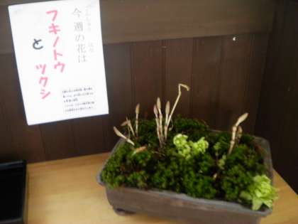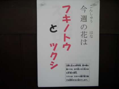 3月24日 今週の花は,フキノトウとツクシです。まだ朝夕寒さが厳しいですが,野山には春の草花が顔を出しています。フキノトウやツクシ,ネコヤナギなどが春が来たことを告げています。このフキノトウとツクシは,亀岡市の日当たりのいいあぜ道に咲いていました。