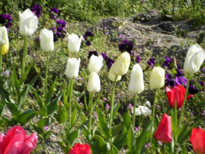 4月11日 今朝の7時30分現在の気温16度。暖かな陽気で花壇の赤・白・黄色のチューリップもいつの間にか満開です。
