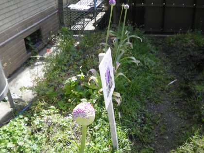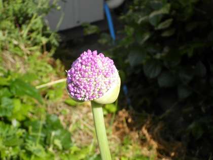 5月16日 昨年暮れに植えたアリウム・ギガンチュームがようやく咲き始めました。長く伸びた茎の先に丸く膨らんだつぼみの丸い玉が割れだし,紫色の花が見え出しました。