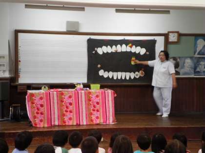6月11日 今日の5校時に1・2年生が歯磨き指導を受けました。歯科衛生士さんと校医さんに来ていただき,虫歯の予防について学びました。実際に歯ブラシを手に持ち,正しい磨き方も教えてもらいました。全校虫歯ゼロをめざし,他学年にも伝達したいと思います。