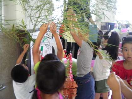 7月2日 今日は,1年生が七夕の笹に飾りや願い事を飾りました。昨日,教室で一生懸命つくった飾りと短冊に書いた願い事を4校時につけました。30人の可愛い願い事が風に揺られていました。